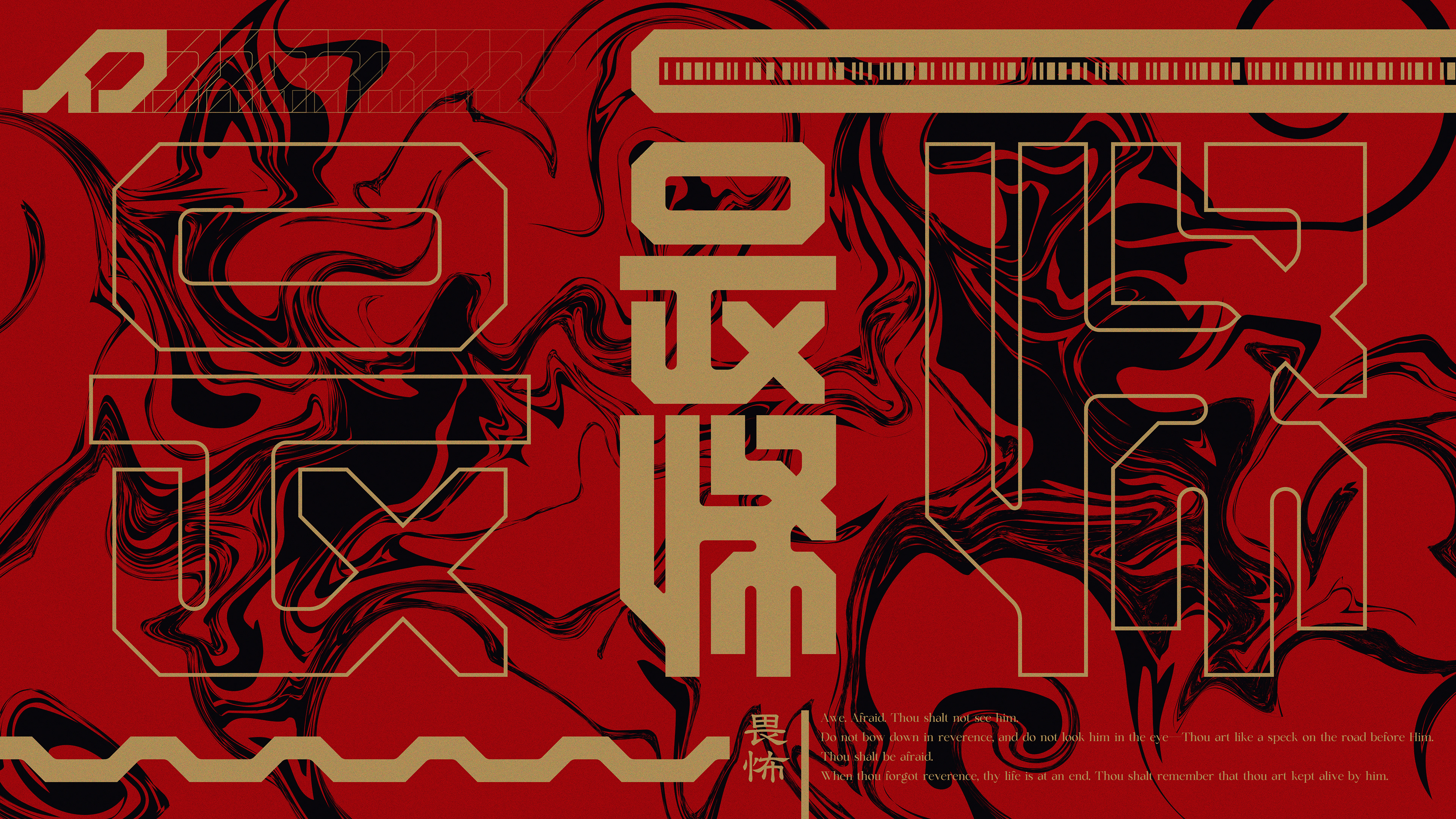 This will be a personal work of graphic design with a motif of awe. The red and gold colors create a sense of luxury, while the black marble pattern in the background expresses a sense of fear.