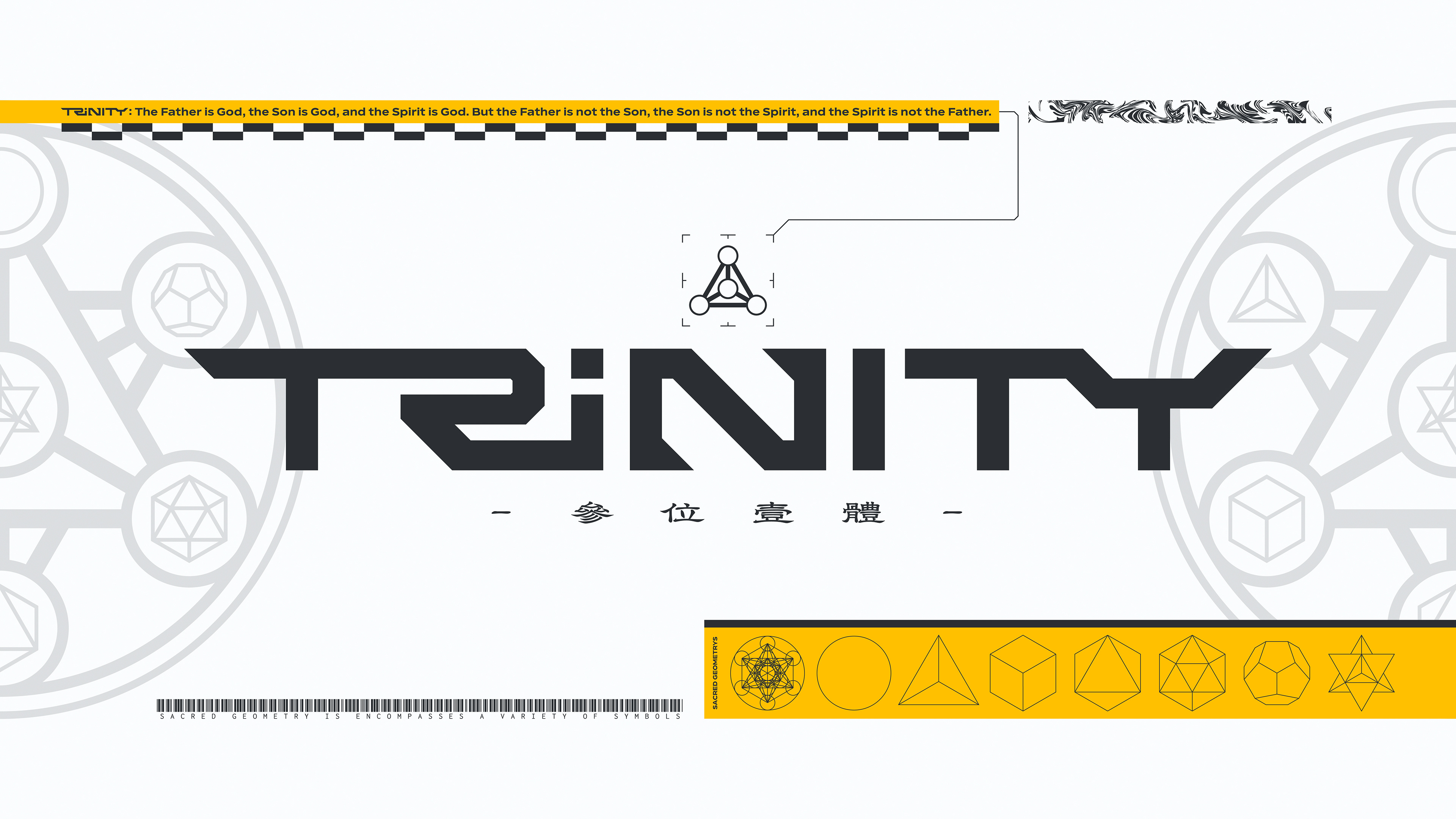 The lettering of the Chinese character for "trinity." Futuristic lettering and gothic and sacred geometric patterns are incorporated to create a graphic adapted to the modern age.